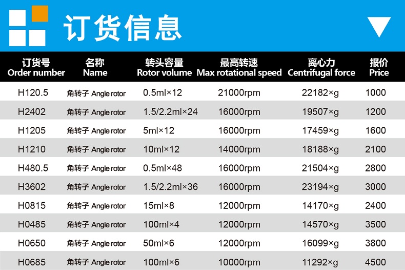 | 訂貨號 | 角轉(zhuǎn)子 | 轉(zhuǎn)頭容量 | 最高轉(zhuǎn)速 | 離心力 |