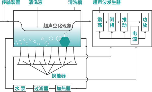 通過換能器,將功率超聲頻源的聲能轉換成機械振動,通過清洗槽壁將超聲波輻射到槽子中的清洗液。由于受到超聲波的輻射,槽內(nèi)液體中的微氣泡能夠在聲波的作用下快速變大破裂,破裂時產(chǎn)生的高強度剪切力作用于各類樣品上,從而達到清洗、提取、乳化、加速溶解、粉碎、分散等作用。