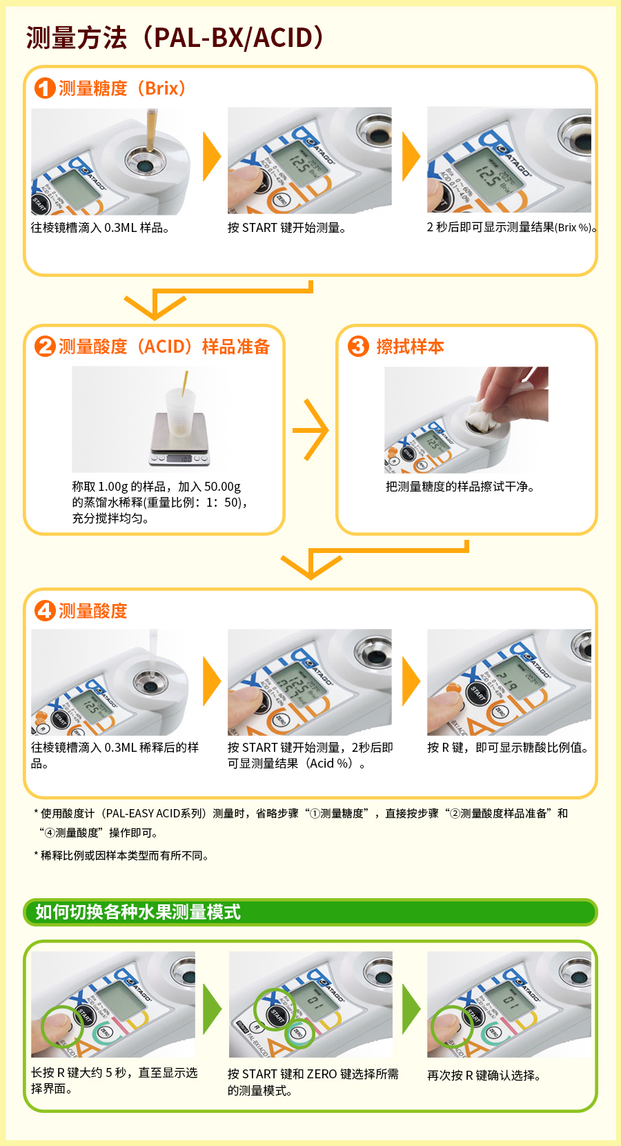 使用ATAGO(愛拓)糖酸度計(jì),糖度可直接取樣測量;酸度測量只需添加蒸餾水與測量樣品按重量比例(1:50)稀釋(即:果汁1ml,蒸餾水50ml)攪拌均勻后即可取樣測量。糖度及酸度測量完成后,按R鍵自動(dòng)顯示糖酸比。