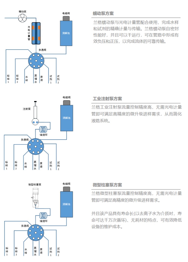在在線水質(zhì)檢測系統(tǒng)中,蘭格產(chǎn)品主要用于傳輸待檢測水樣,以及各種檢測試劑。蘭格可提供不同種類的精密泵解決方案:蠕動泵、工業(yè)注射泵和微型柱塞泵,以滿足不同檢測系統(tǒng)的需求。