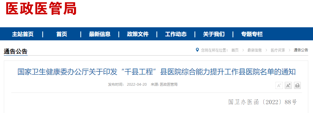 其旨在提高縣醫(yī)院綜合能力,滿足縣域居民基本醫(yī)療服務(wù)需求。未來根據(jù)各縣醫(yī)院醫(yī)療服務(wù)能力評估和工作推進進展,《名單》進一步篩選和擴充。(點擊文章左下角“閱讀原文”,查看完整《“千縣工程”醫(yī)院名單》。)