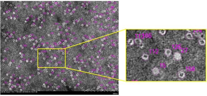 透射電子顯微鏡(TEM)是觀察病毒形態(tài)的最佳工具。日立透射電鏡HT7800有高反差和高分辨兩種模式,能同時兼顧生物組織的大視野觀察和病毒的高分辨觀察。其 Specimen Search (自動顆粒搜索功能)可以自動尋找病毒顆粒,并進行記錄統(tǒng)計。